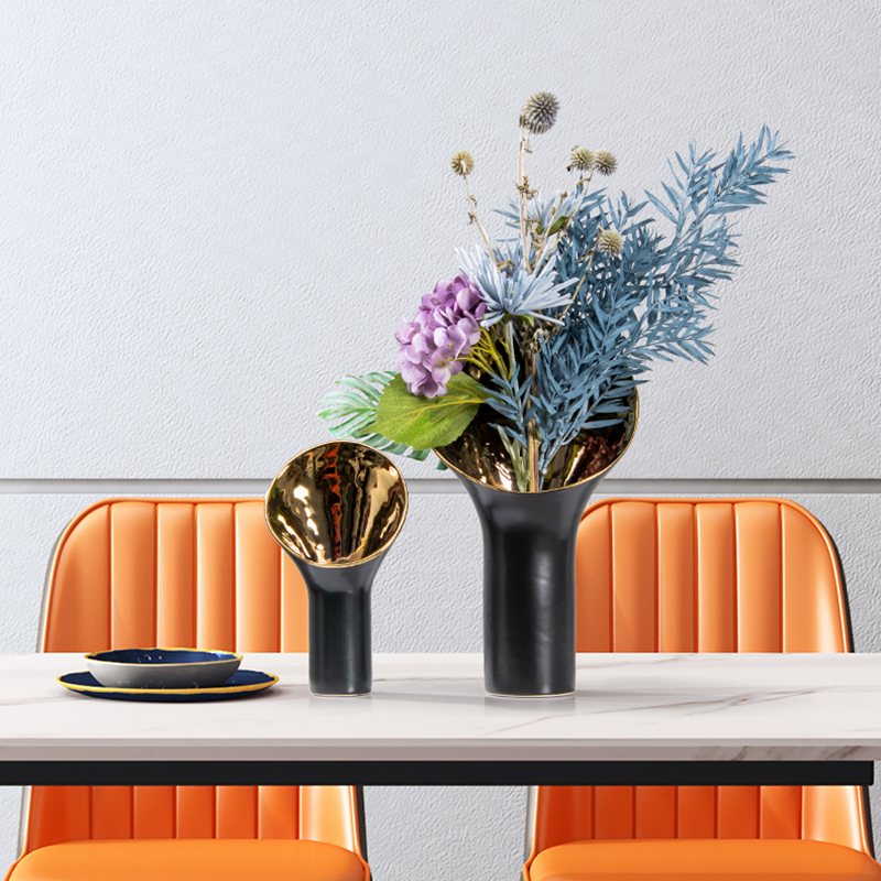 后现代轻奢陶瓷花瓶电镀黑金喇叭插花