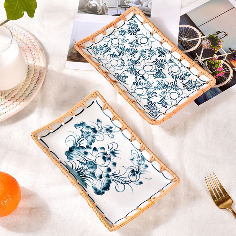 藤瓷拼接收纳碟盘手工编织家用北欧客厅藤瓷餐具