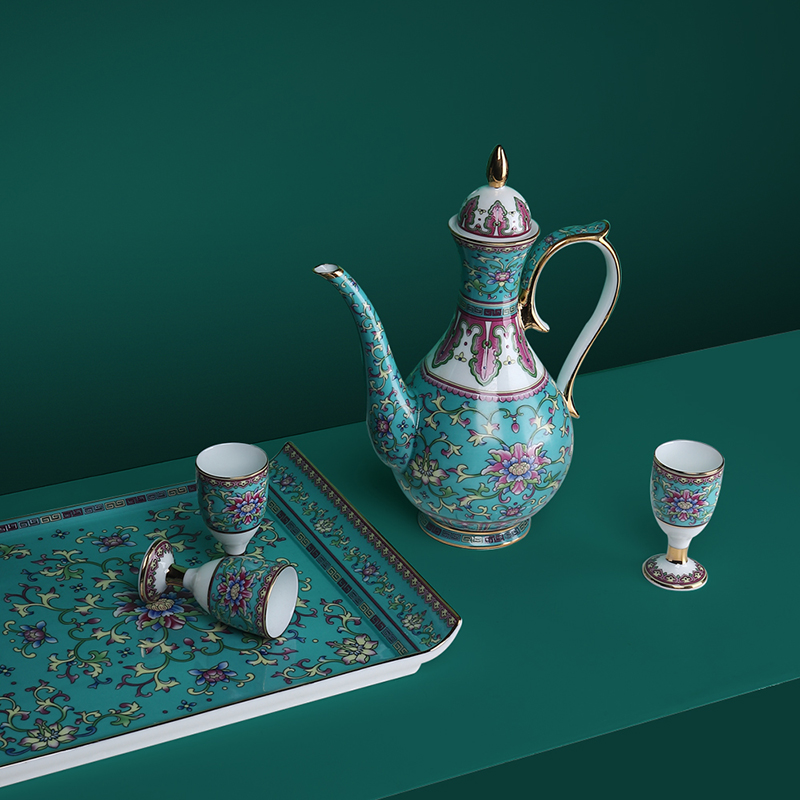 珐琅彩酒具套装家用高档陶瓷绿酒杯中式小酒盅白酒高脚杯