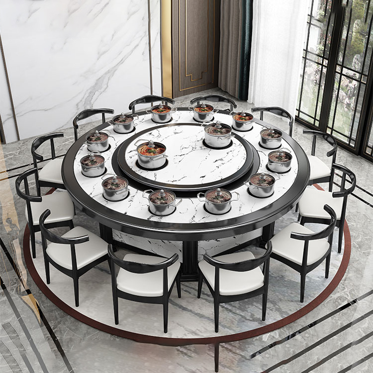 酒店新中式实木电动商用仿大理石带转盘餐桌椅组合