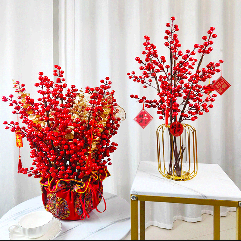 桌面客厅新年发财果红浆果冬青红果假花仿真装饰花摆件花