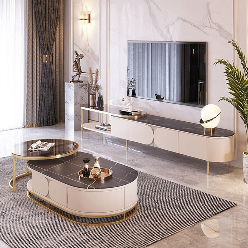 轻奢岩板电视柜茶几组合现代简约小户型伸缩地柜客厅家用椭圆电视柜