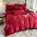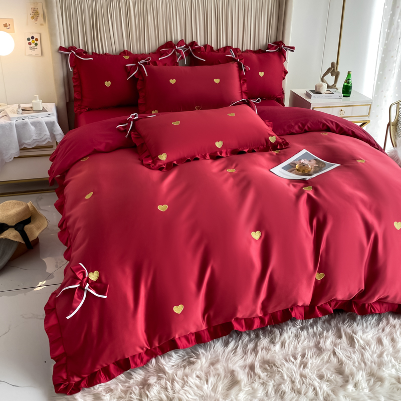 全棉婚庆爱心四件套酒红色刺绣纯棉床单被套新婚房