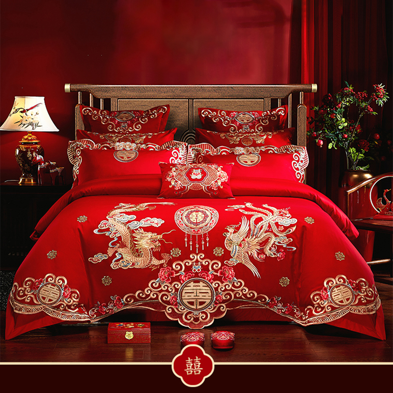 结婚大红色四件套纯棉全棉被套刺绣婚庆新婚床上用品