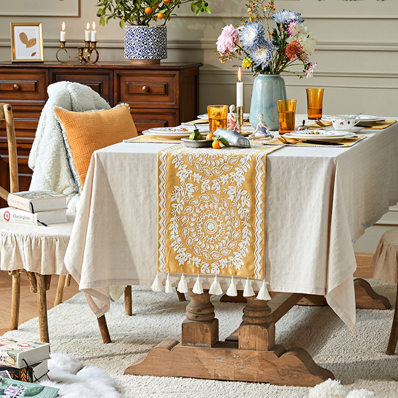 桌旗轻奢北欧餐桌长条流苏茶几边柜黄色床尾巾
